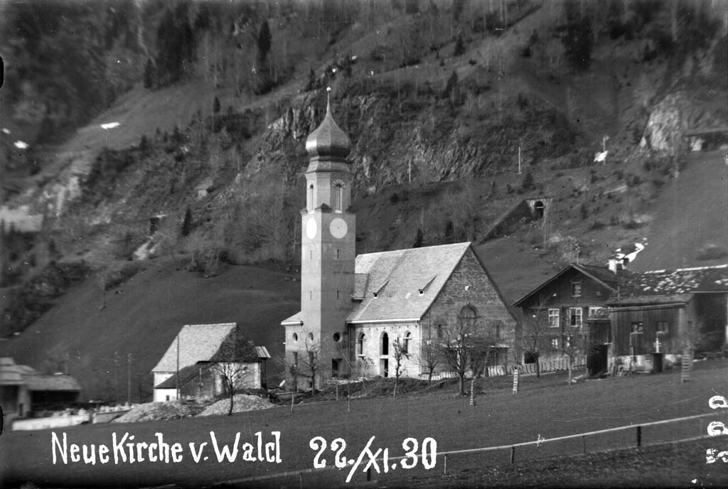 Nachdem durch den Bau der Arlbergbahn 1880 bis 1884 und insbesondere den Bau des Spullerseekraftwerks 1920 bis 1925 die Bevölkerung von Wald massiv zugenommen hatte, wurde ein Neubau nötig. Der damalige Kurat Johann Josef Fiel nahm diesen in wirtschaftlich schwierigen Zeiten 1930 in Angriff. Die Pläne lieferte der bekannte Architekt Willibald Braun aus Bregenz. Einen modernen Kirchenbau wollte er der dörflichen Bevölkerung offenbar nicht zumuten und entschied sich daher für einen eher konservativen, neubarocken Stil.