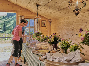 Farmer's wife Andrea Schwarzmann will spoil you at Alpe Steris with her breakfast buffet of farm and regional products, homemade bread, alpine cheese and "riebel". Make your way there (walking time from Marul approx. 2 h, from Sonntag-Stein approx. 1.5 h), so that you can really get hungry. Of course you can also arrive with the Alpbus.